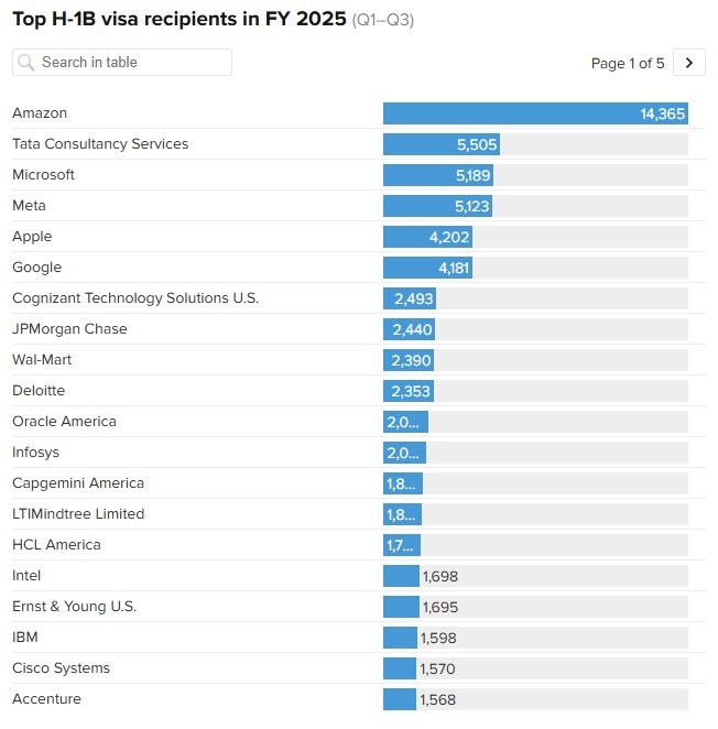 آمازون با استخدام بیش از ۱۴ هزار نفر تا پایان ژوئن، بیشترین تعداد دارندگان ویزای H-۱B را در اختیار دارد و بزرگترین ذینفع این ویزا بوده است. شرکتهای مایکروسافت، متا، اپل و گوگل نیز هر کدام بیش از چهار هزار ویزای H-۱B داشتهاند و جزو ۱۰ پذیرنده برتر در سال مالی ۲۰۲۵ هستند.
