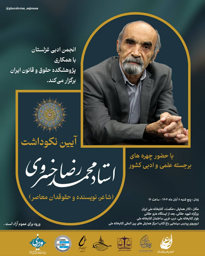 - به منظور ارجنهادن به مقام والای علمی و ادبی استاد محمدرضا خسروی، شاعر، نویسنده و حقوقدان برجسته کشور با تکیه بر رسالت فرهنگی، از سوی انجمن ادبی غزلستان و همکاری پژوهشکده حقوق و قانون ایران برگزار می کند
