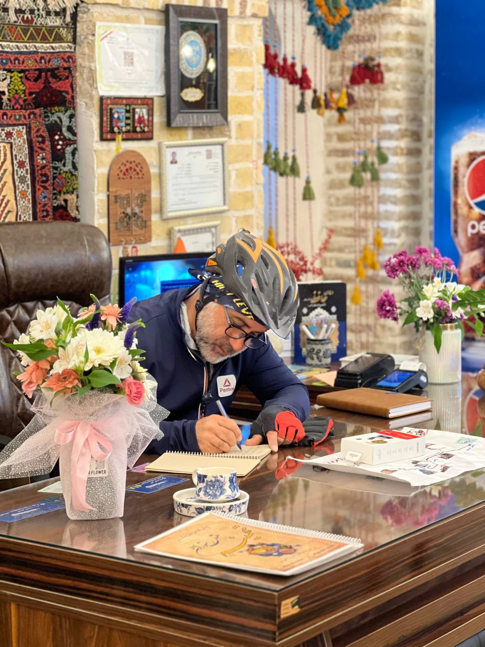((مهندس موسوی در حال نوشتن دیدگاهشان در دفتر مدیر اقامتگاه بوم گردی تهمینه ))